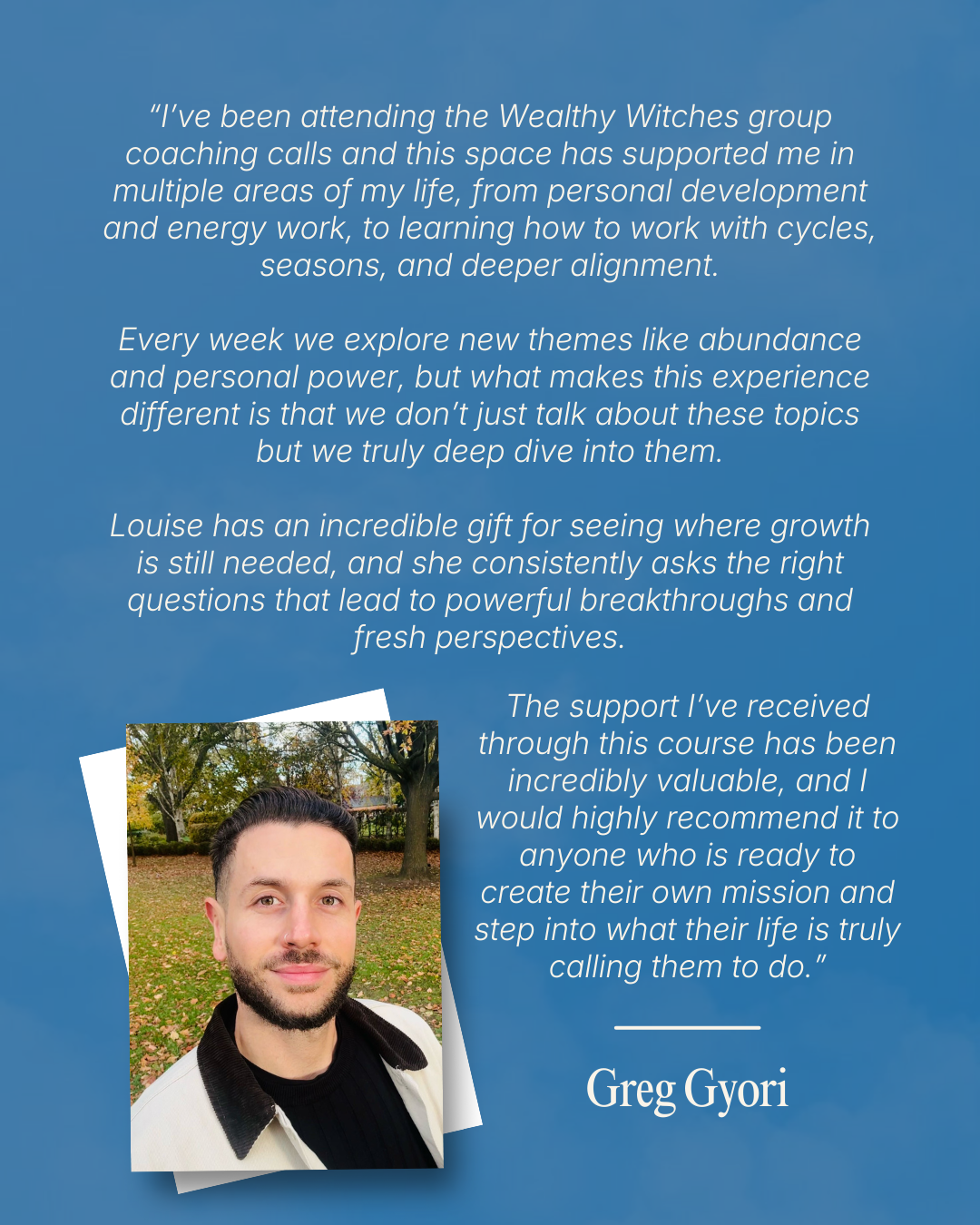 I would 100% recommend Wealthy Witches, if like me, you feel like you’re here to break away from the mundane and do something better, and shine brighter than you are currently are, and Louise is the perfect person to hold your hand throughout that journey.”